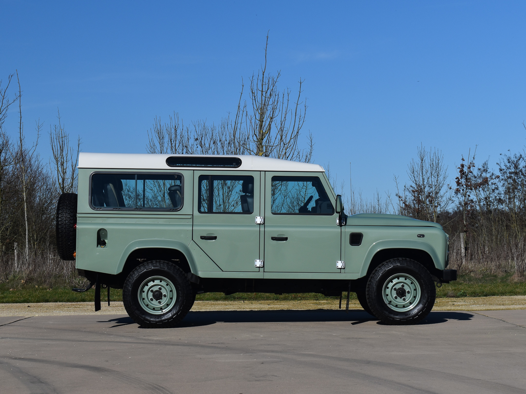 Deze Land Rover Defender 110 Heritage Edition is een gelimiteerde uitvoering die werd gemaakt als eerbetoon aan de originele Land Rover uit 1948 en het einde van de klassieke Defender-productie markeert. Met zijn herkenbare Grasmere Green-kleur, witte dak en heritage-details ademt hij pure historie.